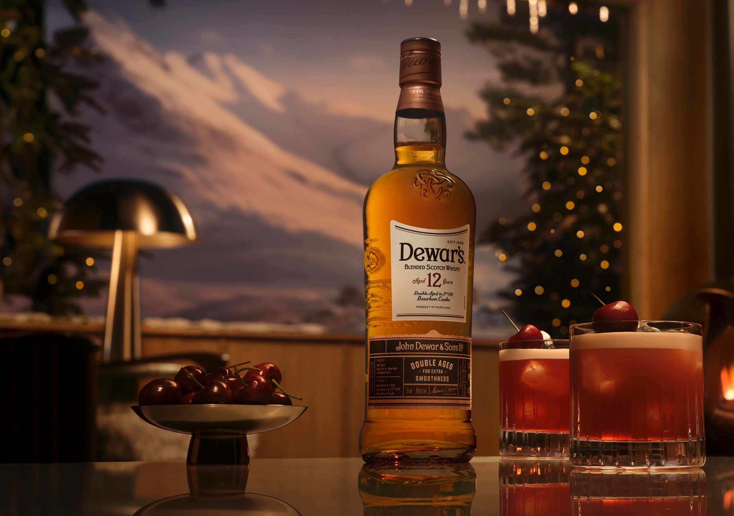 - Add DEWAR’S 12 Year Old whisky, fresh lemon juice, cherry juice, maple syrup and egg white into a shaker with cubed ice.